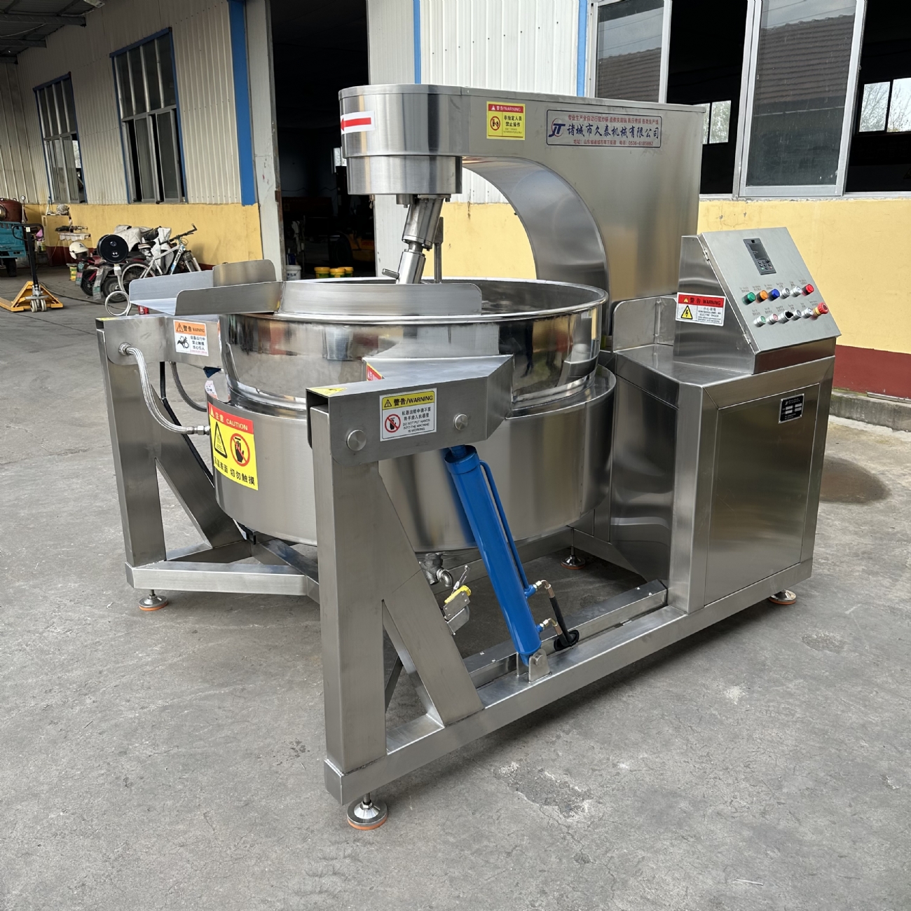 燃?xì)饧訜岫嘧嚢璩村佸伩谥睆綇?50L至1200L,鍋口直徑從1400mm至1600mm,鍋體采用宜興九州12mm厚蝶形封頭,兩組行星共6只攪拌頭刮底攪拌,不易產(chǎn)生糊鍋現(xiàn)象,它的操作非常簡(jiǎn)單,一鍵自動(dòng)點(diǎn)火,帶熄火保護(hù),四環(huán)節(jié)能猛火灶頭每環(huán)可以單控,帶煙筒,集中背部排廢氣,加厚防火水泥,大大降低了炒鍋周圍的溫度,鍋內(nèi)帶有物料測(cè)溫,實(shí)時(shí)顯示物料溫度,達(dá)到預(yù)設(shè)溫度自動(dòng)熄火,低于預(yù)設(shè)溫度自動(dòng)點(diǎn)火加熱,物料炒制完成后可以液壓自動(dòng)抬臂、自動(dòng)九十度翻鍋出料,配有遙控系統(tǒng),方便一人操作控制出料。