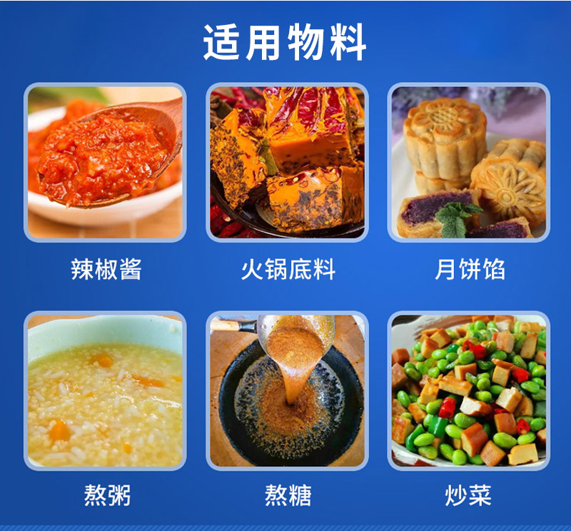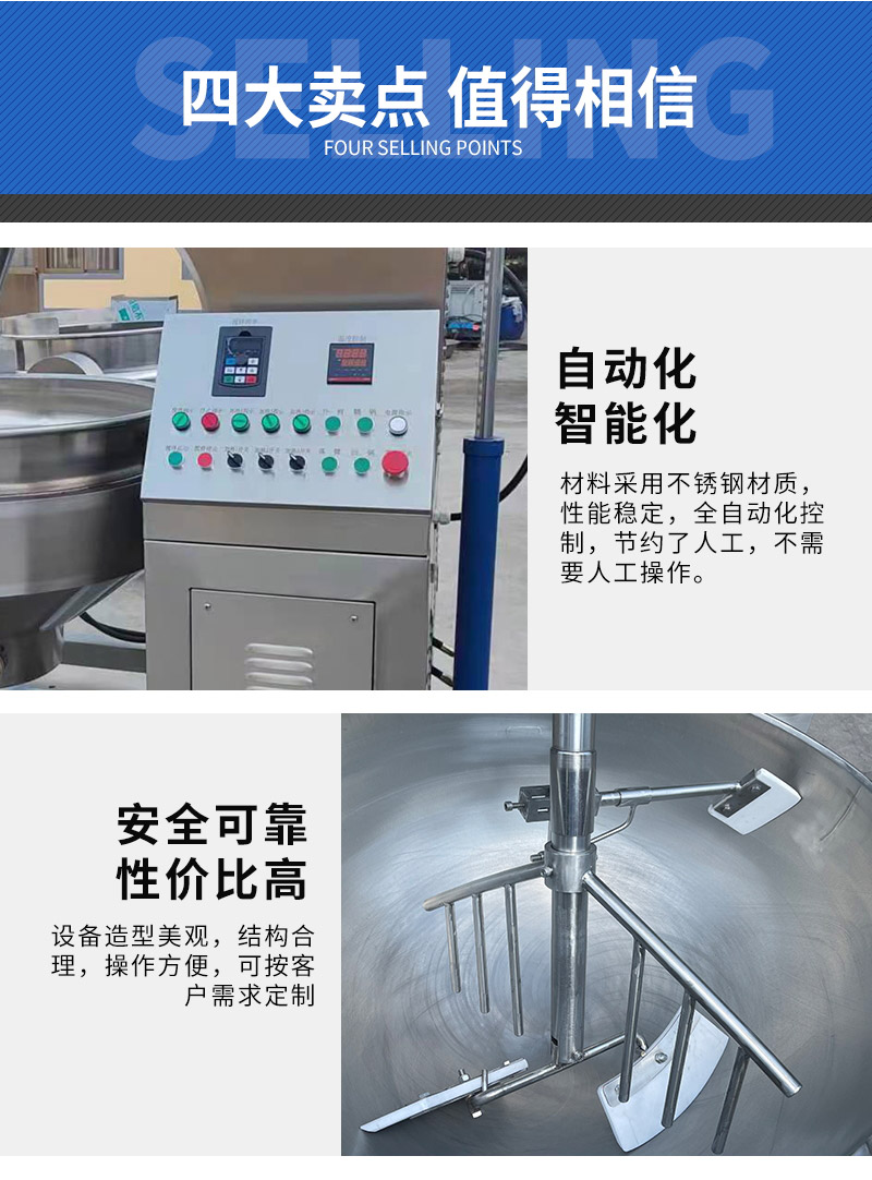 設(shè)備采用304不銹鋼制成,攪拌方式為行星刮底攪拌,攪拌無(wú)死角,不粘鍋、糊鍋,攪拌速度變頻可調(diào),從零到高速任意調(diào)節(jié),運(yùn)行更平穩(wěn)。配有溫度顯示裝置,可設(shè)定溫度,到達(dá)溫度自動(dòng)斷電??蓪?shí)現(xiàn)單控、雙控,從而調(diào)控功率大小,方便顧客使用。其外掛設(shè)計(jì)更人性化,操作、清洗使用更合理,液壓傾斜倒料系統(tǒng)更穩(wěn)定可靠,被廣泛應(yīng)用于食品業(yè)加工中。
